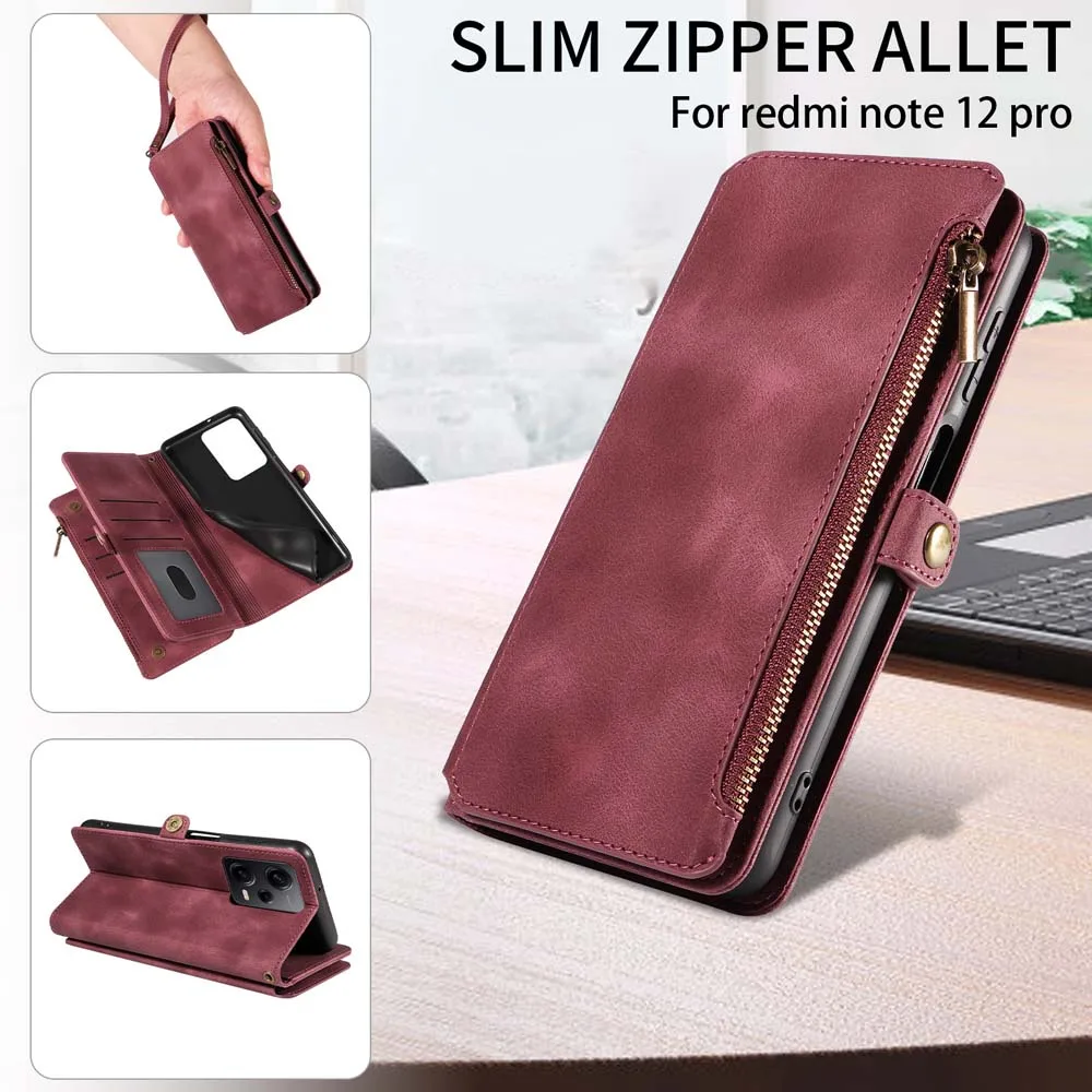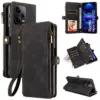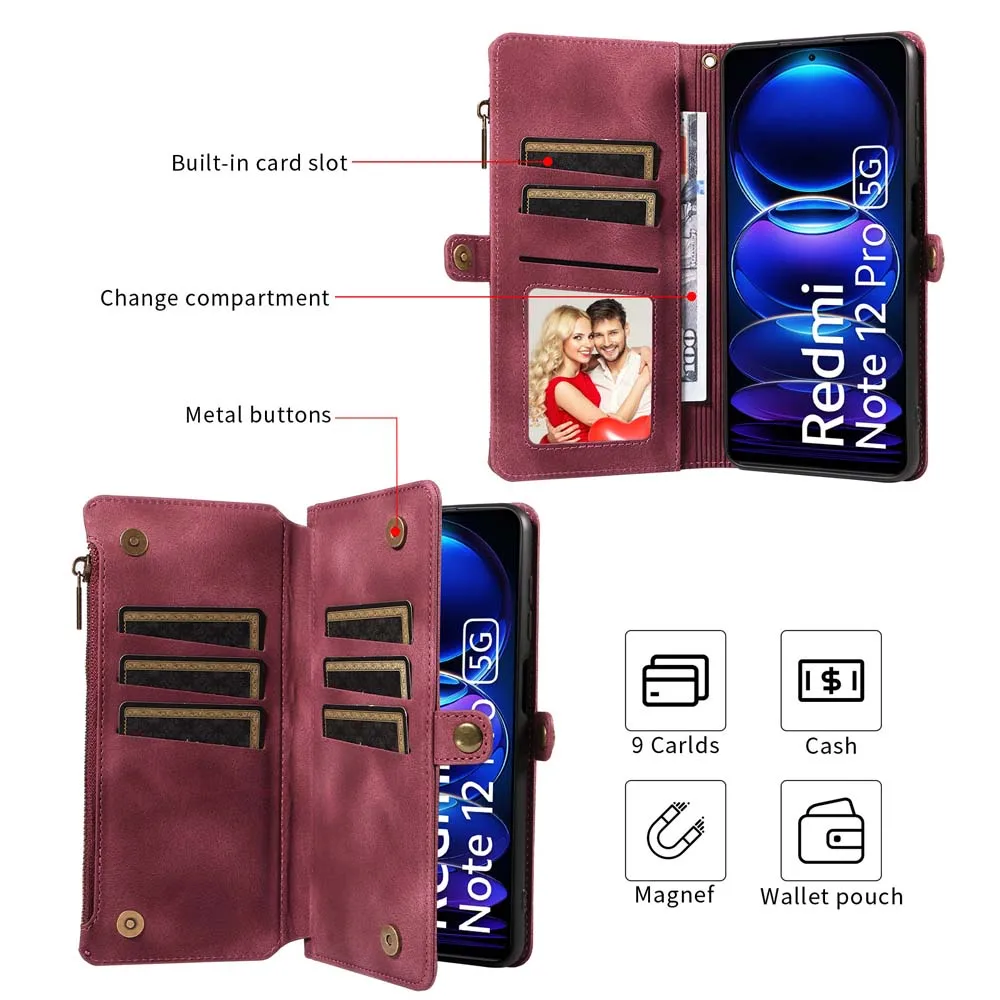 Multi-pocket Leather Wallet Case for Redmi 12C 13C Phone Bumper Magntic Flip Handbag Wallet Pouch with Zip Wrist Strap Card Slot